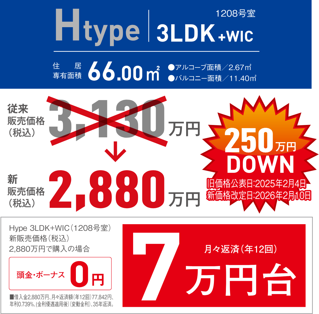 - ■ 提携住宅ローンのご案内 住信SBIネット銀行/融資を受けるには所定の審査が必要です。審査結果によりご希望に添えない場合があります。予めご了承ください。■申込資格・条件/1.借入時満18歳以上満65歳以下で、最終完済時の年齢が満80歳未満の方 2.団体信用生命保険に加入が認められる方 3.給与収入のみの場合、同一勤務先に原則として3ヶ月以上勤務している方。自営業・法人代表(その家族を含む)の場合、3年以上継続して営業している方 4.日本国籍を有する方または日本に永住権のある方で、永住者または特別永住者の記載のある住民票(在留資格記載)を提出できる方 5.国内にお住まいの方 6.安定した収入のあると認められる方 7.共有者は担保提供者(物上保証人)となります。収入合算者の方は連帯保証人となっていただきます。(住宅ローン控除対象外)■ご融資金額/500万円以上3億円以内(10万円単位)で売買価格および諸費用分■利率/0.739%※利率は融資実行時の利率が適用■返済期間:1年~35年(1年単位)※最長50年まで借入れ可能ですが36年以上は金利が上乗せとなります。金利種別:変動金利型・固定特約金利型(2年・3年・5年・7年・10年・15年・20年・30年・35年型)利率は毎月見直しされますので販売担当者へご確認ください。■ご返済方法/元利均等毎月返済または元利均等毎月返済とボーナス元利均等6ヶ月返済(ただし、ボーナス返済は融資額の50%以内)元金均等毎月返済または元金均等毎月返済とボーナス元利均等6ヶ月返済(ただし、ボーナス返済は融資額の50%以内)■ご返済日/12日・17日・22日・27日より選択(当日が休業の場合は翌営業日)■事務取扱手数料/銀行手数料 融資金額×2.2%(消費税込)■ローン斡旋事務手数料/ローン提携会社に対して、申込1件につき88,000円(ペアローンの場合は2口)をお支払いいただきます(消費税込)■火災保険/火災保険に加入していただきます。付保する保険会社はお客さまの任意選択■団体信用生命保険/全疾病保障特約付団体信用生命保険に加入していただきます(保険料は金融機関が負担)■金銭消費貸借契約書等貼付用収入印紙代/ネットでの契約手続きの場合、収入印紙代は不要です。書面での契約手続きの場合は借入額に応じた収入印紙が必要です。■抵当権/ご融資の対象となる住宅およびその敷地に住信SBIネット銀行㈱を抵当権者とする第一順位の抵当権を設定します。なお、ペアローン及び金利ミックス型ローンの場合、抵当権設定は2本となります(抵当権の設定登記費用(登録免許税、司法書士報酬等)はお客様負担)■繰上返済手数料/繰上返済内容により無料~33,000円(消費税込)※資金計算等は、2026年2月10日現在のものです。融資条件、金利等、金融情勢にて変更される場合があります。